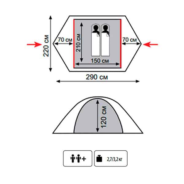 Благодаря двухслойной структуре и двум 70-сантиметровым тамбурам внутри шатра формируется комфортный микроклимат. Воздушная прослойка сохраняет стабильную температуру. Два вентиляционных клапана обеспечивают естественный воздухообмен в комнате. Спальное место имеет размеры 150х210 см., вес комплекта 3,2 кг.