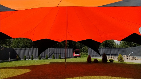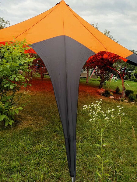 Тент -шатёр звезда. Название говорит само за себя: это яркая звезда имеет оригинальный выразительный дизайн, вместительность и простор. Закрывает большие площади 75м2 размещает приблизительно 60 человек.