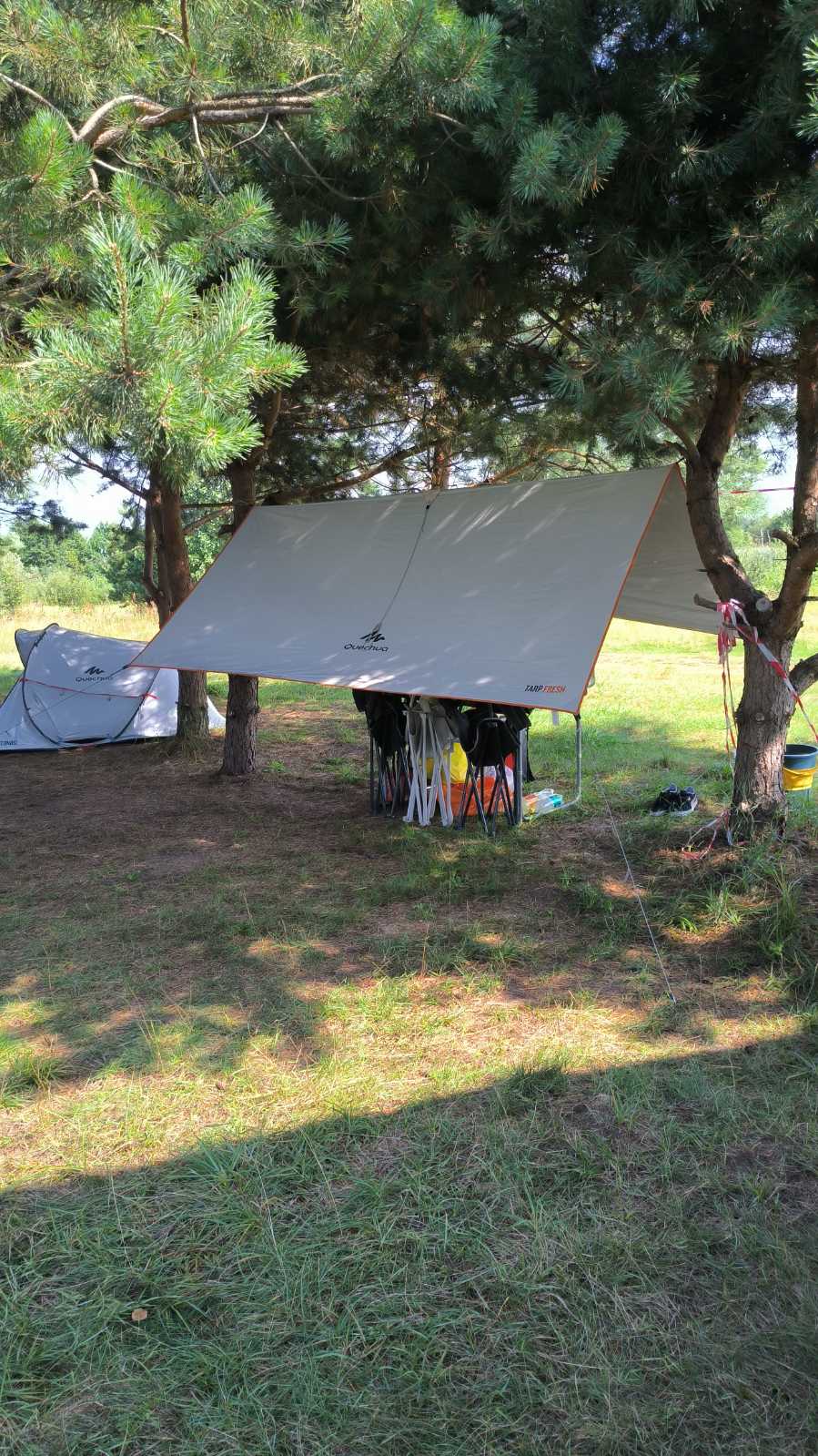 Аренда простого, лёгкого и удобного тента Quechua Tarp Fresh 290×285 значительно облегчит ваш быт в походных условиях. Его можно использовать как простую растяжку от солнца, двускатный шатёр от дождя, навес перед входом в палатку или трейлер. Светлый полиэстер с полиуретановой пропиткой, изготовленный по технологии Fresh&Black, хорошо притеняет и уменьшает дискомфорт от летнего зноя. В жаркий сезон вы будете чувствовать себя под ним гораздо лучше, чем на раскалённых улицах Минска. Пропитка делает материал водоотталкивающим. Центральный шов прошит и проклеен, поэтому в дождь под тентом всегда сухо. Устанавливается навес за несколько минут с помощью простой системы регулируемых стальных стоек диаметром 16 мм и растяжек. Максимальная занимаемая тентом площадь 9 м². Максимальная высота 180 см. В сложенном состоянии изделие имеет размер 39х11 см. Очистить материал от грязи легко, разложив его на ровной площадке и протерев мокрой тряпкой. Прокат выдаёт тенты на любой срок, который клиенты захотят провести на природе. Цена услуги тем меньше, чем дольше арендуется снаряжение.