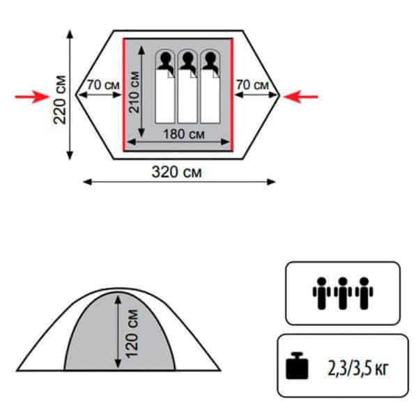 Модель имеет одну комнату, два тамбура и два входа. Размер спального места 180х210 см. Общий размер палатки 220х320 см. Высота по центру 120 см. Вес изделия 3,5 кг. Шатёр складывается и упаковывается в компактный чехол. Так палатку выдаёт прокат снаряжения.