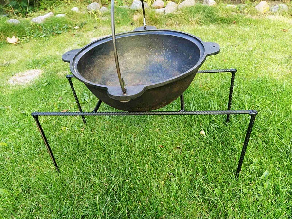 Подставка предназначена для крепления казана или котелка над костром. Съемные ножки позволяют сэкономить место в в рюкзаке или в багажнике вашего автомобиля. Перед установкой для безопасности сделайте углубление в земле, в котором разведете костер.