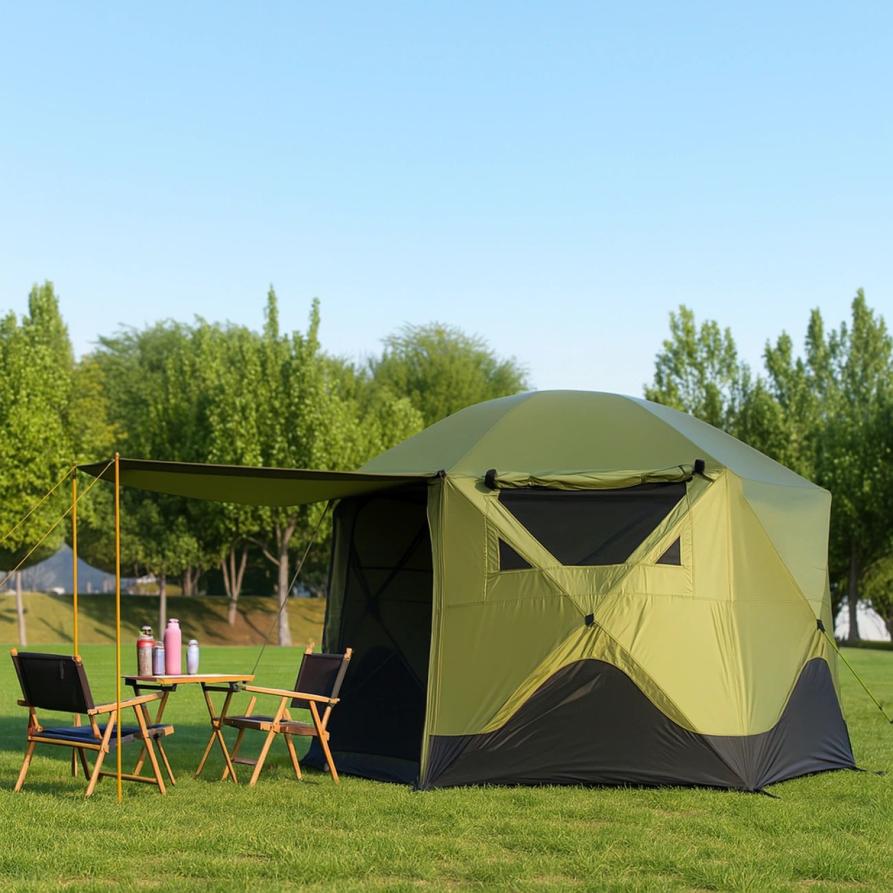 · Многофункциональность: Уникальная конструкция с выходом для трубы позволяет использовать шатер как полевую кухню, палатку для почевки, каторая вмещает 6 человек, летнюю беседку на даче или укрытие для рыбалки. Также это отличный вариант аренды для бассейна.