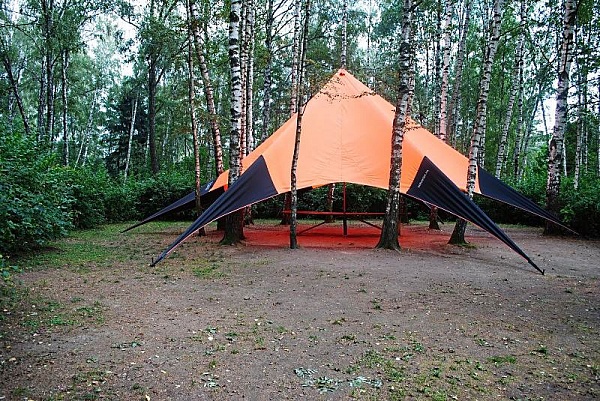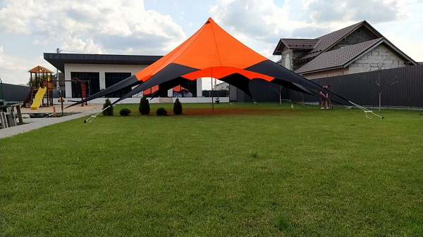 Тент -шатёр звезда. Название говорит само за себя: это яркая звезда имеет оригинальный выразительный дизайн, вместительность и простор. Закрывает большие площади 75м2 размещает приблизительно 60 человек.