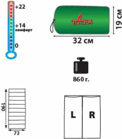 Спальный мешок сшит из полиэстера с водоотталкивающим покрытием. Наполнителем служит лёгкий тёплый Hollofiber. Дышащая подкладка сохраняет внутри застёгнутого одеяла комфортную влажность и тепло. В нём можно ночевать под открытым небом за пределами Минска при температуре от +14°C. Загрязнения с поверхности легко вытираются мокрой чистой тряпкой.